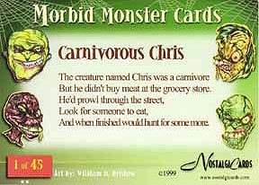 This was the first series of trading cards made by NostalgiCards. They combined themes popular to trading cards from the nostalgic 1960's and 1970's to come up with this series of artwork monsters. The fronts all show images of the monsters head (similar to the popular Ugly Stickers series) while the back contains a clever limerick about the beast. |